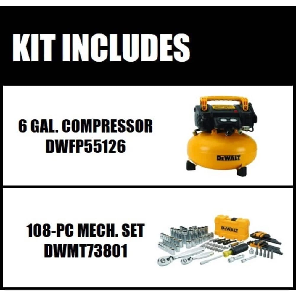 The DEWALT DWFP55126 6 Gal. Air Compressor is designed with a high efficiency motor for easy start up in cold weather or extension cord applications. This compressor has 2 universal couplers to easily support 2 users. The DWFP55126 features a long life oil-free pump for maintenance-free operation. For a limited time get a 1/4 in. x 3/8 in. Drive Polished Chrome Mechanics Tool Set (108-Piece) with purchase.
