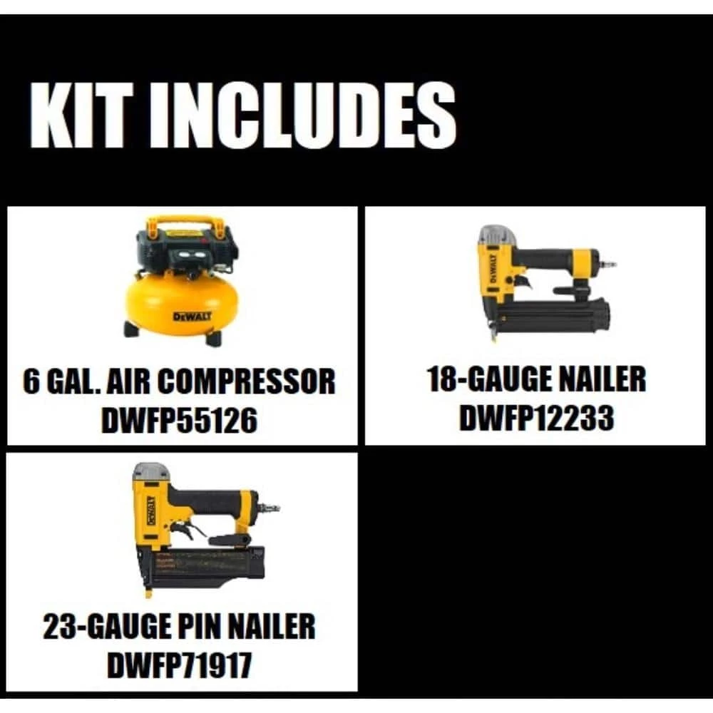 The DEWALT DWFP55126 6 Gal. Air Compressor is designed with a high efficiency motor for easy start up in cold weather or extension cord applications. This compressor has 2 universal couplers to easily support 2 users. The DWFP55126 features a long life oil-free pump for maintenance-free operation. For a limited time get a 18-Gauge Pneumatic Corded Brad Nailer and 23-Gauge 2 in. Pin Nailer with purchase.