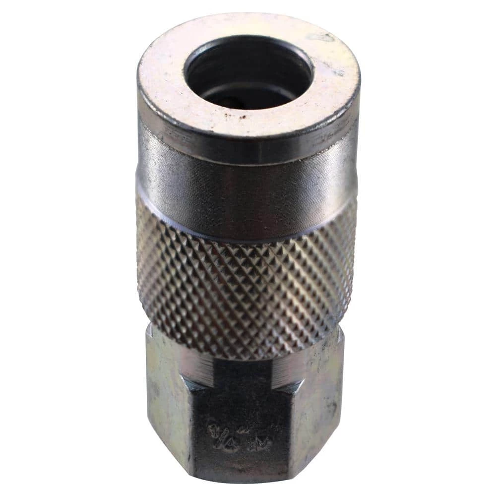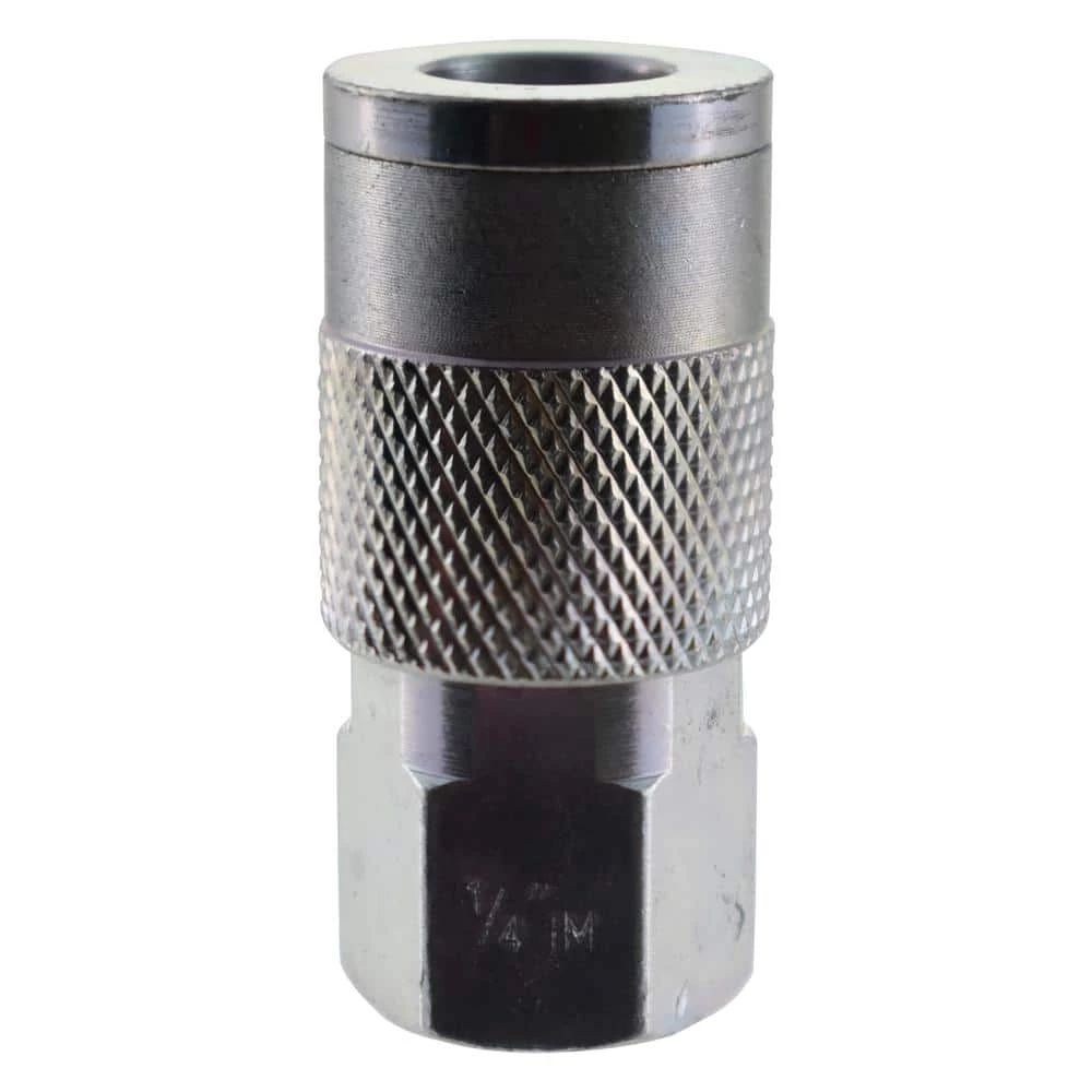 The Husky 1/4 in. x 1/4 in. NPT Female Industrial Steel Coupler eliminates coupler confusion. The durable zinc-plated steel body resists corrosion and features one 1/4 in. snap-in and one 1/4 in. screw-on fitting. A nice addition to any workshop.