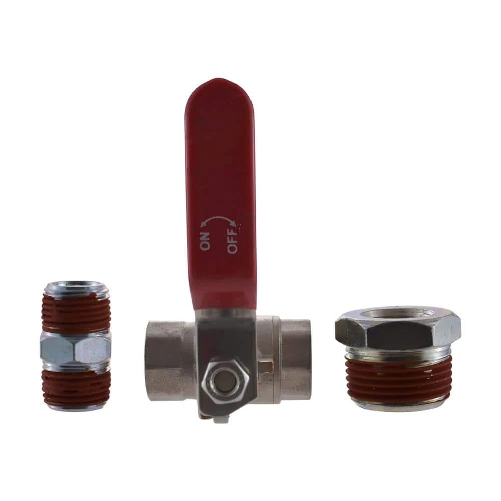 The Husky 3-Piece Vertical Air Shut-Off Kit includes adapters that connect air compressors with 3/4 in. NPT female ports to standard 3/8 in. hose or piping. Constructed from durable brass with a steel ball and Teflon seals, the kit includes a quarter-turn handle that quickly turns air on and off. The high-capacity airflow design reduces pressure drops for better tool performance.