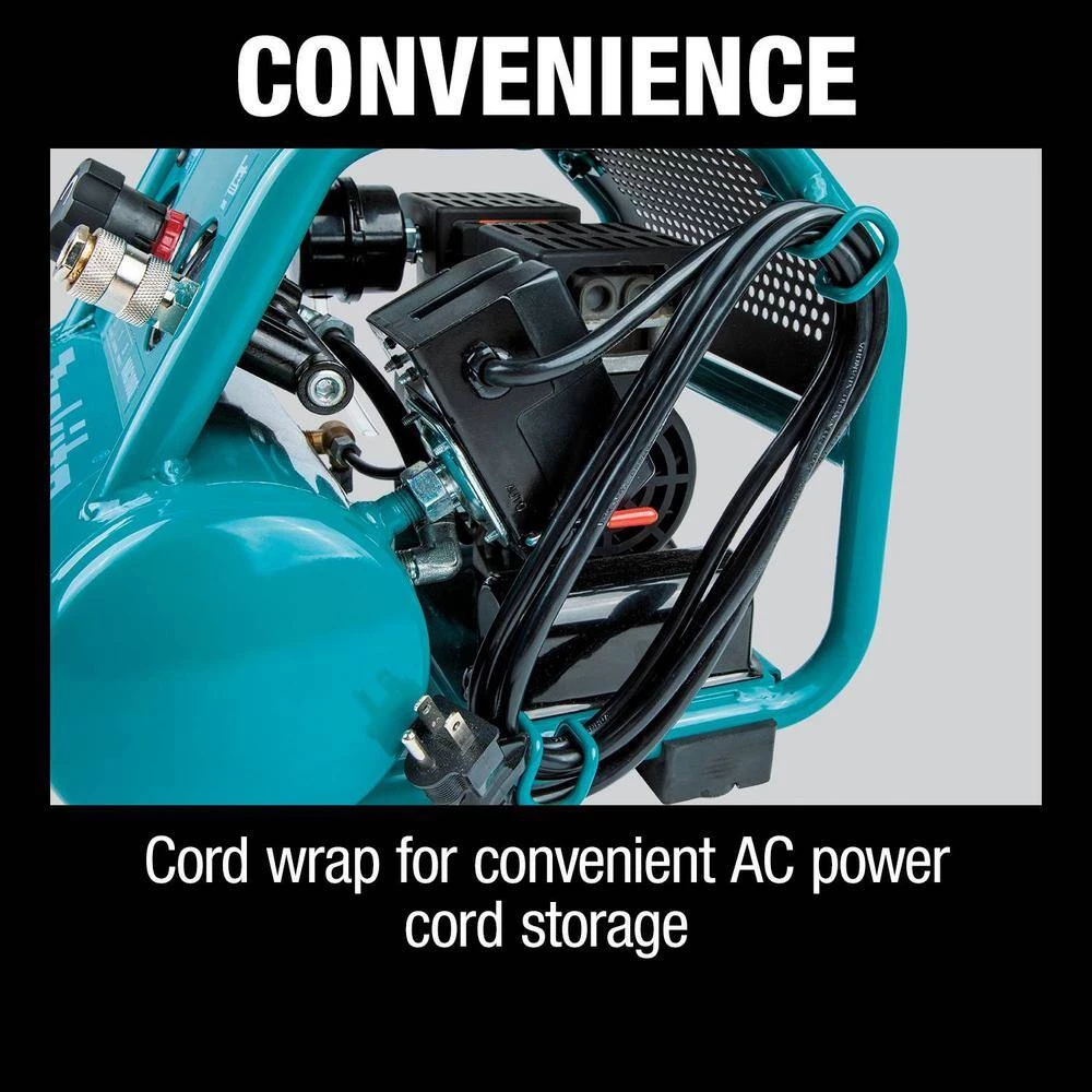 Compressors are workhorse tools on the job site and in the work shop. Makita Air Compressors are favorites for their faster recovery time, lower noise, longer tool life and consistent performance. The Makita HP 1 Gal. Compact, Oil-Free, Electric Air Compressor (MAC100Q) features a Quiet Series Design, combining strong performance with lower noise. At only 58 dBA, its ideal for indoor use during case and base installation, trim and finish carpentry, cabinet or furniture making and more. The MAC100Q runs at a lower RPM, resulting in longer motor and pump life. It is powered by an efficient 1/2 horsepower induction motor that provides up to 135 psi. It also features a lightweight design (only 25.5 lbs.) for increased portability. The roll-cage construction provides added protection for the pump and motor assembly during transportation, in storage and on the job site. Additional features include a low AMP draw that reduces the incidents of tripped breakers at start-up, as well as an oil-free dual-piston pump designed for maintenance-free operation. This bundle also includes the AF506 Pneumatic 2 in. 18-Gauge Brad Nailer.