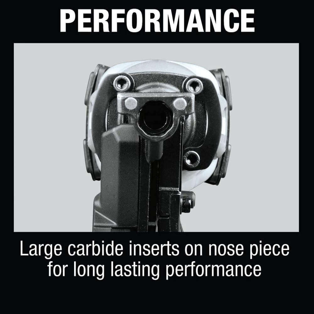 The Makita 1-3/4 in. Roofing Coil Nailer (model AN454) combines rugged construction and robust performance with less weight (only 5.2 lbs.). The AN454 accepts standard 0.120 shank diameter coil roofing nails from 3/4 in. to 1-3/4 in. nails in length. The AN454 is engineered for longer tool life with durable and lightweight aluminum housing and an easy-loading adjustable canister. Ease-of-use features include a “tool-less” depth adjustment engineered for more precise control and flush nailing. Additional features include large carbide inserts on the nosepiece for long lasting performance. Oversized steel wear plates are engineered to reduce abrasion on the tool.