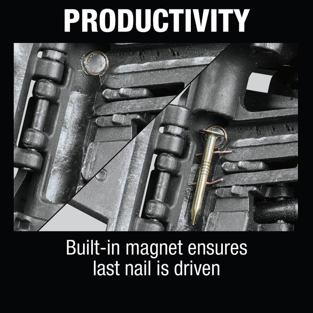 - Easy, 1-step open, adjustable canister system for faster, more precise nail loading