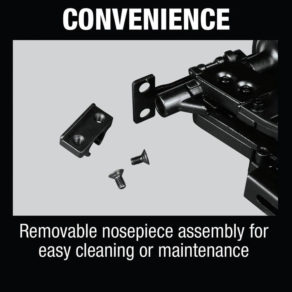 - Tool-less depth adjustment dial for more precise control in flush nailing shingles