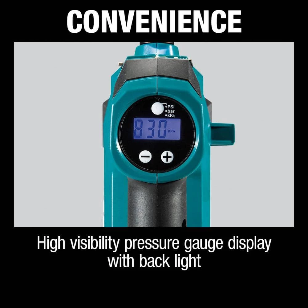 Inflate car tires, bike tires, or sports balls quickly with the 18-Volt LXT Cordless Inflator. The Makita-built motor delivers up to 120 psi. The tool features a high visibility pressure gauge display with backlight, LED light and an auto-stop function when the desired pressure is reached. A 25-1/2 in. hose length provides better reach. The compact design allows for easy portability and convenient storage. It’s part of Makita’s expanding 18-Volt LXT System, the world’s largest cordless tool system powered by 18-Volt lithium-ion slide-style batteries. Makita 18-Volt LXT Lithium-Ion Batteries have the fastest charge times in their categories, so they spend more time working and less time sitting on the charger. For improved tool performance and extended battery life, Makita created Star Protection Computer Controls. Star Protection is communication technology that allows the Star Protection-equipped tool and battery to exchange data in real time and monitor conditions during use to protect against overloading, over-discharging and overheating. For increased versatility, the tool can also be powered by Makita 18-Volt LXT Lithium-Ion Batteries with the Star Symbol on the battery indicating Star Protection inside.