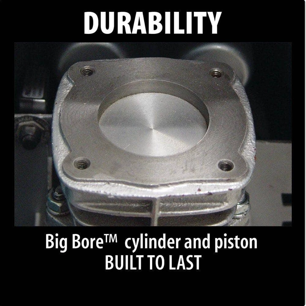 Makita 2.0 HP Air Compressor (MAC700) is equipped with Makita Big Bore engineered pump cylinder and piston for higher output, less noise and improved jobsite performance. The MAC700 delivers industrial power and results with improved durability for tough job site conditions. The MAC700 is powered by a 2.0 HP motor. The Makita Big Bore engineered pump with cast iron cylinder has greater bore and stroke for increased compression, faster recovery and less noise.