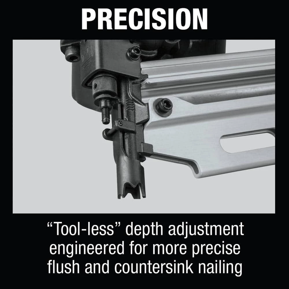 - “Tool-less” depth adjustment engineered for more precise flush and countersink nailing