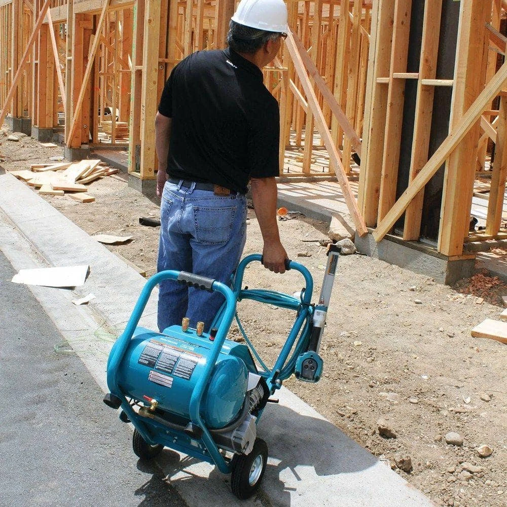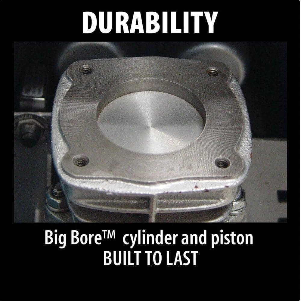 Makita’s 3.0 HP Air Compressor is equipped with Makita’s Big Bore engineered pump cylinder and piston for higher output for two nailers, with less noise and improved job site performance. The MAC5200 delivers industrial power and results with improved durability, and it also includes rugged wheels and a folding handle for easy transport. The MAC5200 is powered by a 3.0 HP motor with built-in thermal overload for additional protection. The engineered pump with cast iron cylinder has greater bore and stroke for increased compression, faster recovery and less noise.