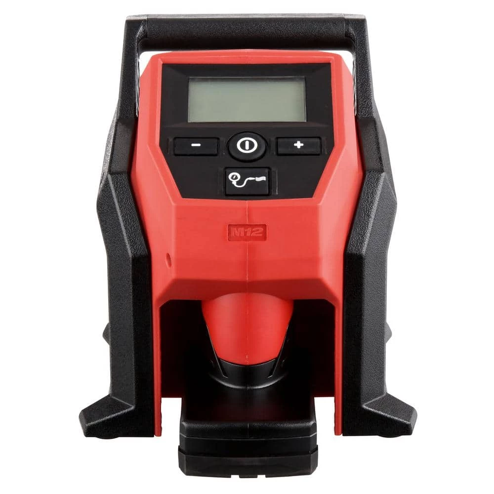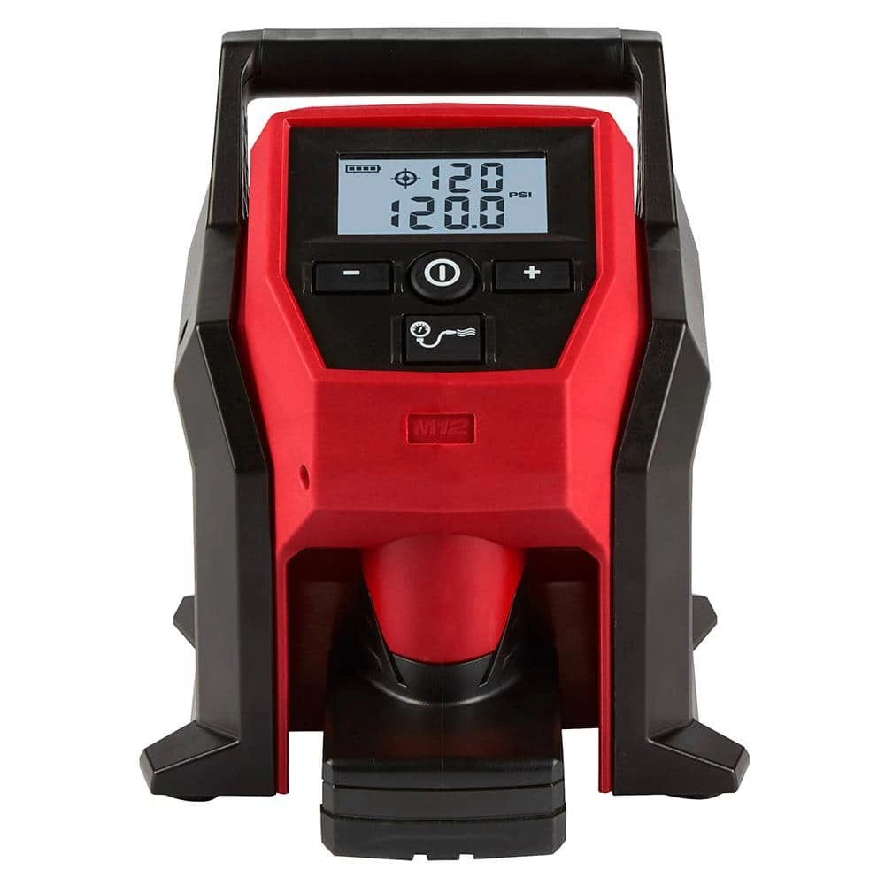 Fastest Cordless Tire Inflator. The Milwaukee M12 Compact Inflator delivers fast, accurate, easy inflation with the portability to take anywhere. The inflator has the capability to complete demanding applications like car, LT truck, and compact equipment tires, the M12 Compact Inflator gives users ultimate power and efficiency. Rated to deliver over 120 psi. The high efficiency motor and pump top-off car tires in under 1-minute. The True Fill Auto shut-off technology delivers highly accurate pressure, protects from overfill, and automatically senses speed of fill to deliver precise shut-off at the desired PSI. Additionally, the unit includes a large easy to read back-lit LCD, anti-vibration feet, and 26 in. hose with an all brass Schrader chuck.
