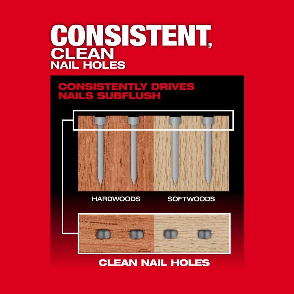 The Milwaukee M18 FUEL 18ga Brad Nailer delivers peak productivity at the jobsite, providing users with unmatched nailing performance without the hassle of a compressor and hose. Leveraging a nitrogen air spring mechanism, the finish nailer enables users to consistently sink nails to the proper depth in hard and soft woods while leaving clean nail holes matching the head of the nail. The combination of Milwaukee’s POWERSTATE Brushless Motor and REDLINK PLUS Intelligence delivers users with unmatched fire rate with zero ramp-up time keeping them efficient throughout their day. Additionally, the cordless brad nailer operates using Milwaukee’s REDLITHIUM Batteries (not included) and sealed compressed nitrogen to drive each nail, completely eliminating the cost of gas cartridges and maintenance associated with competitors nailers. The 18-Gauge nailer is compact in size, and very lightweight, providing users with unmatched access into tight spaces and limiting their fatigue throughout their day. The M18 FUEL 18ga Brad nailer delivers the pneumatic performance that professional carpenters and remodelers expect with the freedom and convenience of cordless.