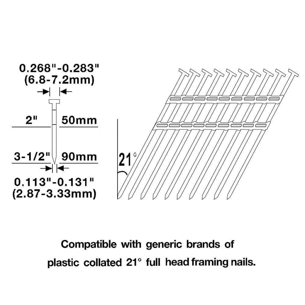 - Compatible Nails: 21 degree plastic collated full round head framing nails from 2 in. – 3-1/2 in. L and 0.113 in. – 0.131 in. diameter