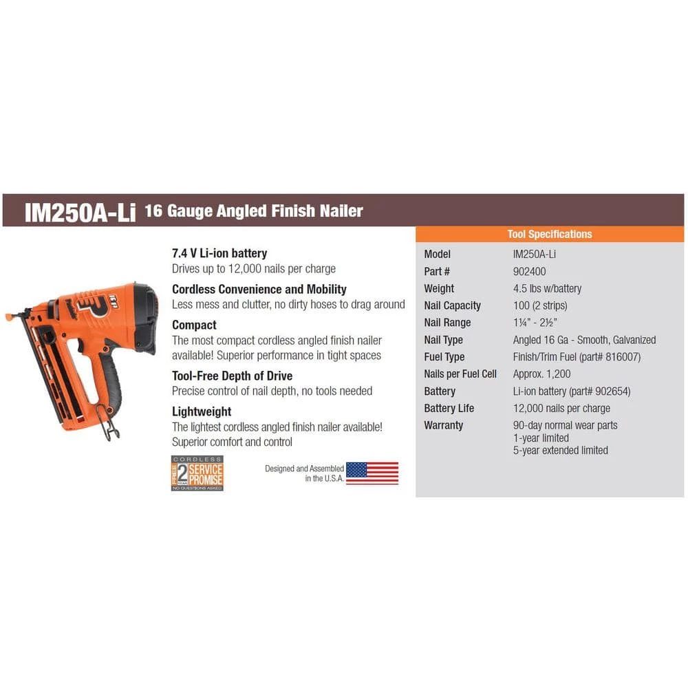 - Tool kit includes: 16-Gauge angled lithium-ion cordless finish nailer, rechargeable 7.4-Volt lithium-ion battery, lithium-ion battery charger, rugged carrying case, owners manual, safety glasses, 5/32 in. hex wrench