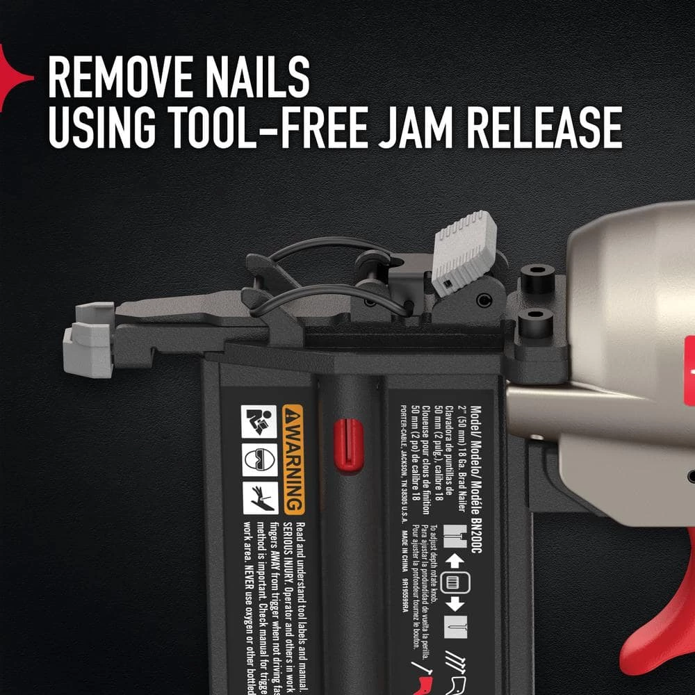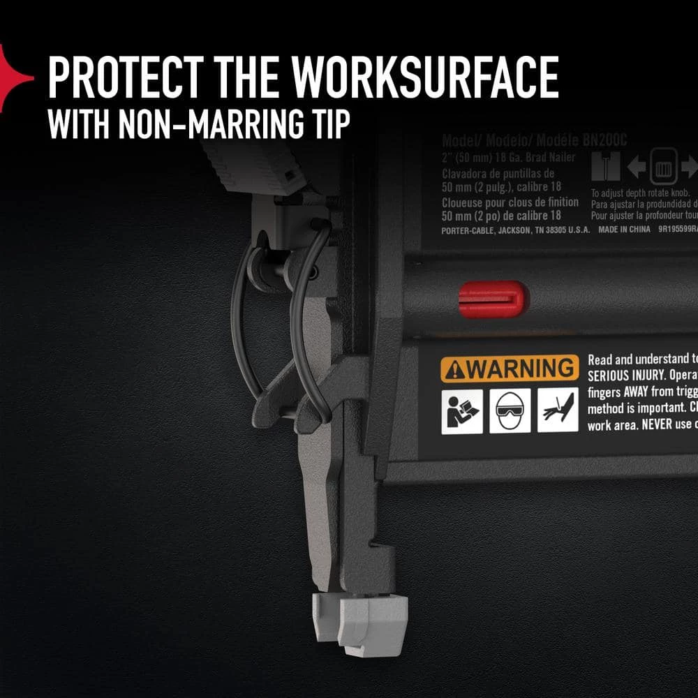 The Porter-Cable BN200C 18-Gauge 2 in. Brad Nailer Kit Drives 18-Gauge nails from 5/8 in. to 2 in. length. This brad nailer features a long life maintenance-free motor to keep from staining the work surface. Designed with a magnesium body for strength and lightweight use. The kit includes carrying case, removable non-marring nose tip and owner’s manual.
