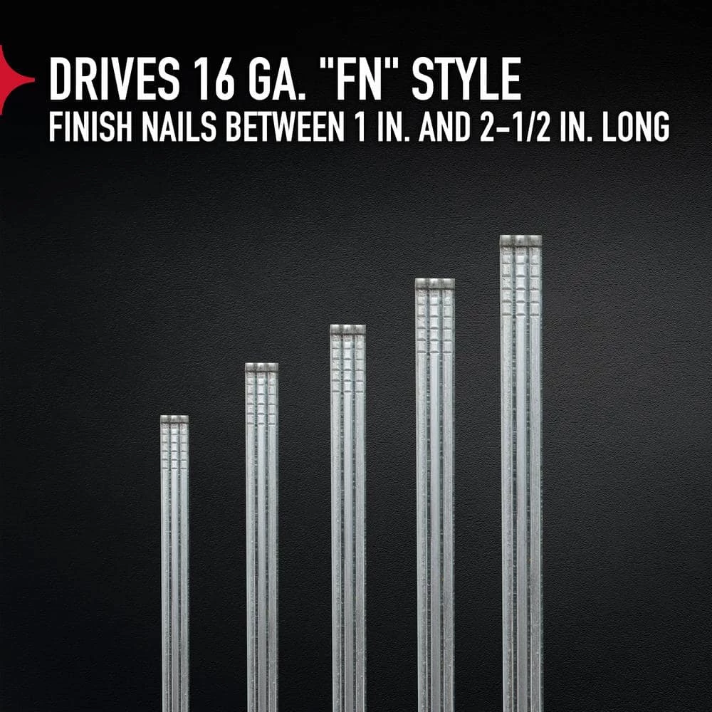 - Drives 16-Gauge FN style finish nails from 1 in. – 2-1/2 in. length