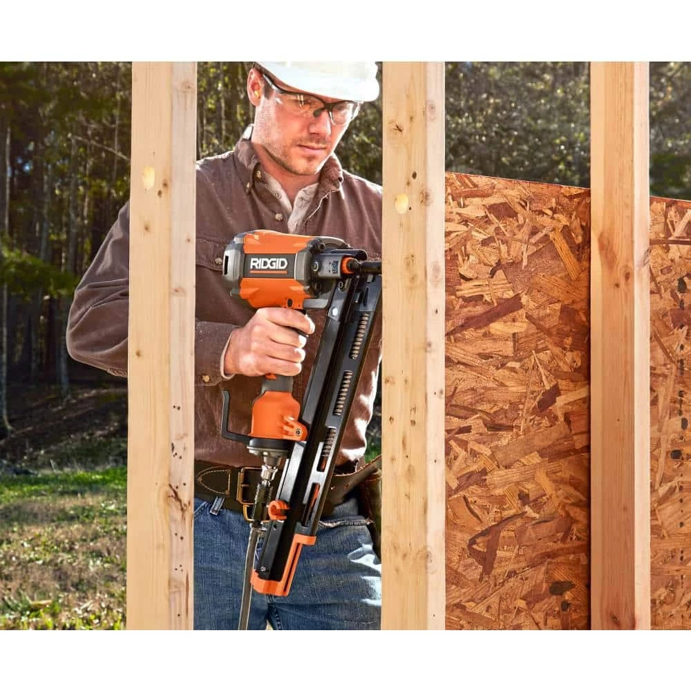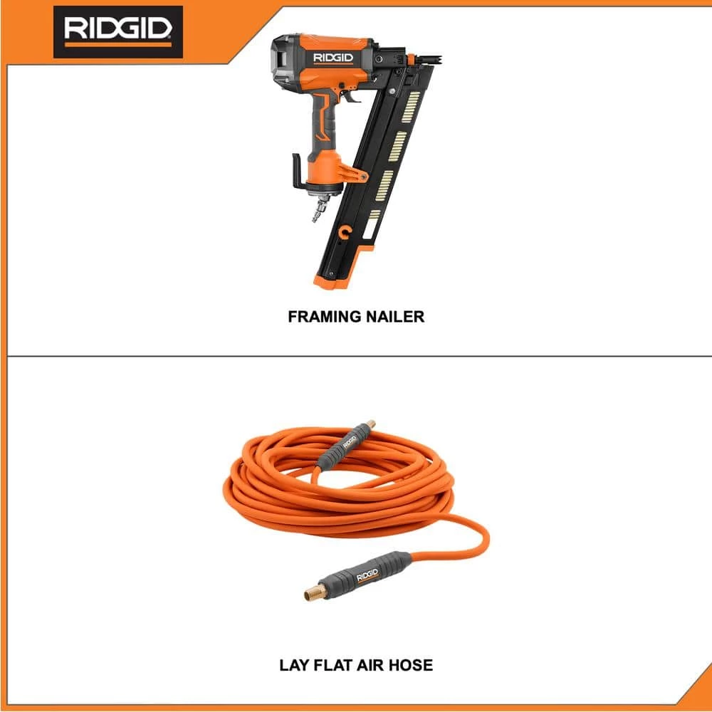 RIDGID introduces the 21-Degree 3-1/2 in. Round Head Framing Nailer with 1/4 in. 50 ft. Lay Flat Air Hose. Featuring Magnesium Metal Housing, this nailer is the fastest in its class at 8 nails per second compared to competitors 3 nails per second. This nailer is backed by the RIDGID Industry Leading Lifetime Service Agreement. That means FREE Parts. FREE Service. For LIFE. Included with the Round Head Framing Nailer are a swivel quick connect, no-mar pads, and an operator’s manual. The RIDGID Lay Flat Hose has a unique lay flat design that allows it to keep its shape, is kink resistant and is non-tangling. At just over 3 lbs. for a 50 ft. hose, its lightweight design makes it easier for you to maneuver around your work space. Heavy-duty 360° swivel fittings with bend restrictors make the usual weakest point, one of this hose’s strengths. The durability of the bend restrictors provide extra support to increase the life of the hose. Unlike other hoses, the Lay Flat Hose is able to flex in cold weather, which allows you to keep working regardless of your climate. Its 100% field repairable which saves you time and money in case of an accidental tear. With a 300 Max PSI capacity, the RIDGID Lay Flat Hose can be used for heavy-duty applications. The 1/4 in. 50 ft. Lay Flat Air Hose is warranted against defective parts and labor and includes 360° swivel fittings.