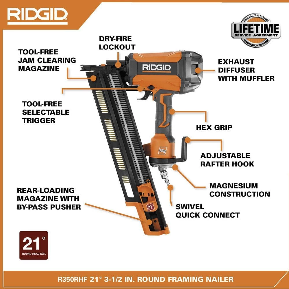 RIDGID introduces the 21-Degree 3-1/2 in. Round Head Framing Nailer. Featuring Magnesium Metal Housing, this nailer is the fastest in its class at 8 nails per second compared to competitors 3 nails per second. This nailer is backed by the RIDGID Industry Leading Lifetime Service Agreement. That means FREE Parts. FREE Service. For LIFE. Included with the Round Head Framing Nailer are a swivel quick connect, no-mar pads, and an operator’s manual.