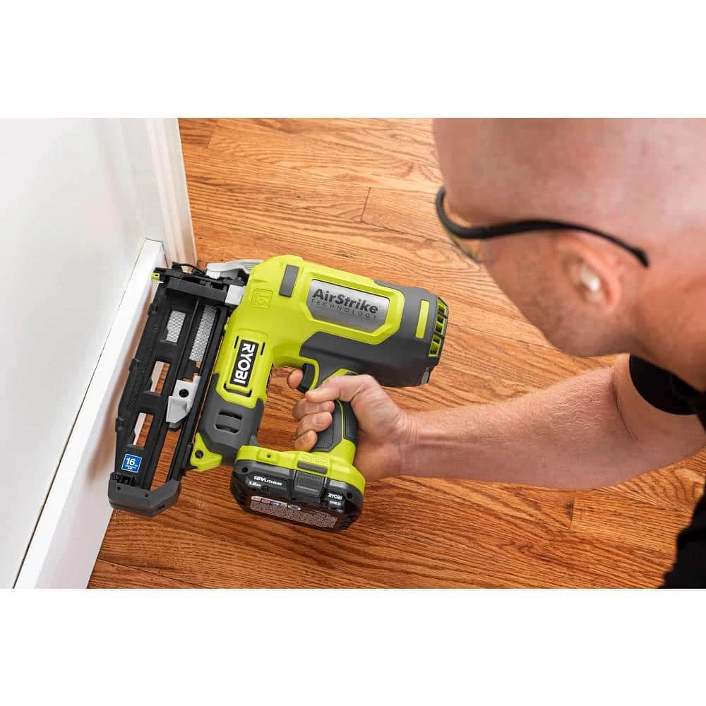 RYOBI introduces the 18V ONE+ 16-Gauge Cordless AirStrike Finish Nailer with 1.5 Ah Battery and Charger. This Finish Nailer features AirStrike Technology, which eliminates the need for noisy compressors, bulky hoses, or expensive gas cartridges. This means faster setup and easy maneuverability on the job site. This Straight Finish Nailer is capable of sinking up to 2-1/2 in. nails in hardwoods. The tool-free depth of drive adjustment allows for proper setting of nail heads. This nailer allows for extended periods of continuous work by sinking up to 1,000 nails per charge. It additionally offers a 78% smaller nose for tight spot access and superior drive quality, compared to P325. There is also a convenient adjustment dial to regulate air pressure speed for optimal performance. Great for crown molding, baseboard and exterior trim, this Finish Nailer is the perfect addition to any carpenter or DIYer’s tool collection. The included battery and charger are compatible with all RYOBI 18V ONE+ Tools. Best of all, it is part of the RYOBI ONE+ System of over 260 cordless tools that all work on the same battery platform. This kit is backed by the RYOBI 3-Year Manufacturer’s Warranty and includes 2 non-marring pads, a 1.5 Ah Battery, an 18V Charger, and operator’s manuals.
