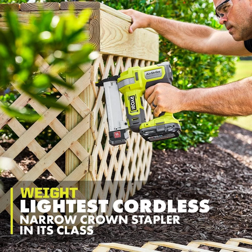 Expand your RYOBI 18V ONE+ System with the 18V ONE+ AirStrike 18GA Narrow Crown Stapler, and enjoy the convenience of AirStrike Technology, eliminating the need for noisy compressors, bulky hoses and expensive gas cartridges. This means faster setup and easy maneuverability on the job site. The RYOBI P361 Narrow Crown Stapler is capable of sinking up to 1-1/2 in. staples in hardwoods. Additionally, it is the lightest cordless narrow crown stapler in its class, helping prevent user fatigue. This stapler allows for extended periods of continuous work by sinking up to 1,700 staples per charge. It also offers a 26% smaller driver blade for superior drive quality, compared to P360. There is a tool-free depth of drive adjustment that allows for proper setting of nail heads. Great for lattice work and floor underlayment, this Crown Stapler is the perfect addition to any carpenter or DIYer’s tool collection. Best of all, it is part of the RYOBI 18V ONE+ System of over 260 Cordless Products that all work on the same battery platform. This 18V ONE+ AirStrike 18GA Narrow Crown Stapler is backed by the RYOBI 3-Year Manufacturer’s Warranty and includes the 18V Narrow Crown Stapler, (2) Non-Marring Pads, and Operator’s Manual. Battery and charger sold separately.