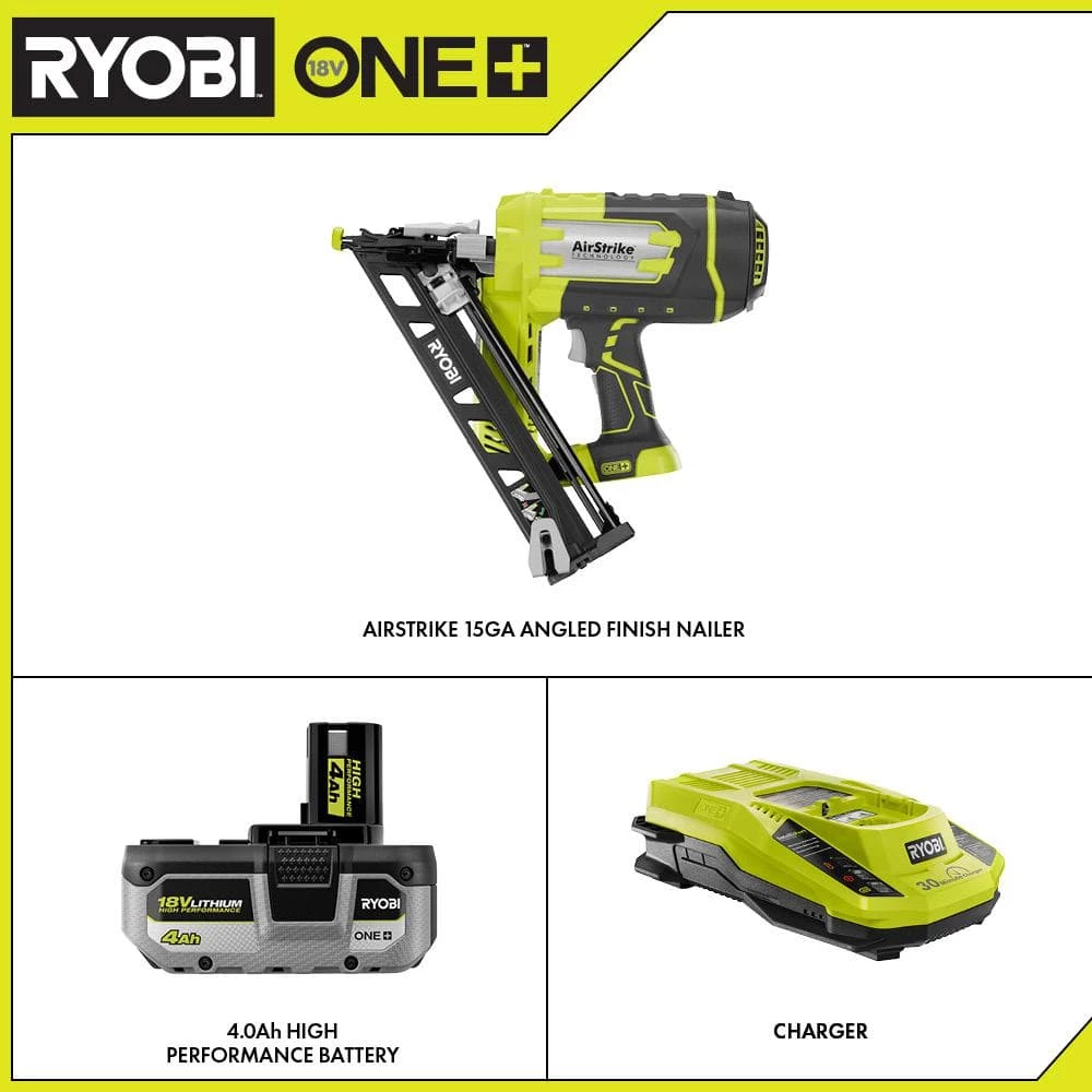 RYOBI introduces the 18V ONE+ Cordless AirStrike 15-Gauge Angled Finish Nailer with HIGH PERFORMANCE 4.0 Ah Battery and Charger Kit. This nailer features AirStrike Technology, which eliminates the need for noisy compressors, bulky hoses, or expensive gas cartridges. This means faster setup and easier maneuvering on the job site or at home. The included 4.0 Ah Battery and 18V Charger are compatible with all RYOBI 18V ONE+ Tools. Best of all, it is part of the RYOBI ONE+ System of over 260 cordless tools that all work on the same battery platform. Backed by the RYOBI 3-Year Manufacturer’s Warranty, the Angled Finish Nailer includes sample nails, a belt clip, an 18V ONE+ HIGH PERFORMANCE 4.0 Ah Battery, an 18V Charger, and an operator’s manual.