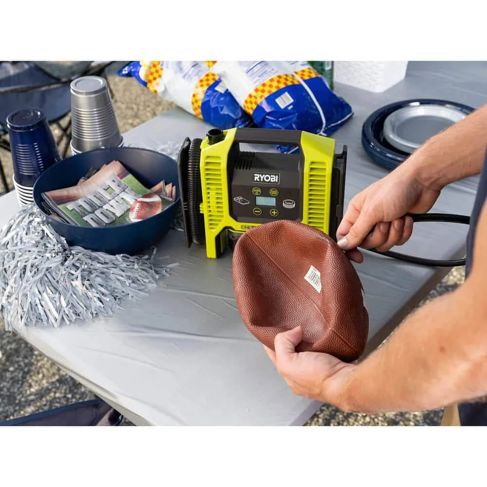 - Includes: (1) P747 18V ONE+ Inflator, high pressure hose, high pressure nozzle, Presta valve adaptor, sports ball needle, high volume hose, pinch valve nozzle, (1) PBP006 18V ONE+ 2.0 Ah Battery, and operator’s manual