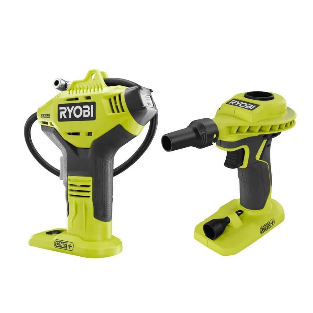 RYOBI introduces the 18V ONE+ Cordless Power Inflator and High Volume Inflator 2-Tool Combo Kit (Tools Only). The High Volume Power Inflator is perfect for fast, high volume inflating and deflating of air mattresses and pool toys. It can inflate a standard twin air mattress in 45 seconds. The pistol grip handles with GRIPZONE overmold to provide user comfort as well as a locking trigger feature that prevents user fatigue. These features will help you power through any job effortlessly. The Cordless Power Inflator is the perfect tool for tires and small inflatables ranging from 0 PSI to 150 PSI. It features an easy to read digital gauge that provides pin point accuracy. The cordless convenience allows for use in virtually any location, such as tight spaces or corners, high pressure applications such as sports balls, or in the driveway. Best of all, it is part of the RYOBI ONE+ System of over 260 cordless tools that all work on the same battery platform. Backed by the RYOBI 3-Year Manufacturer’s Warranty, the Inflator 2-Tool Combo Kit includes a High Volume Power Inflator with two nozzle accessories, a Cordless Power Inflator with a hose, sports needle, and high pressure nozzles, and operator’s manuals. Battery and charger sold separately.