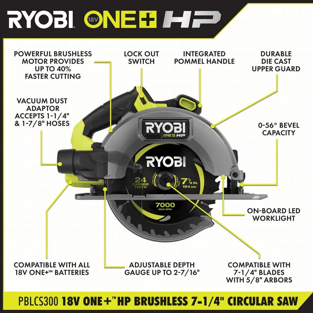 - Brushless 7-1/4 in. Circular Saw: Over 325 cuts per charge using an 18V ONE+ 6Ah battery